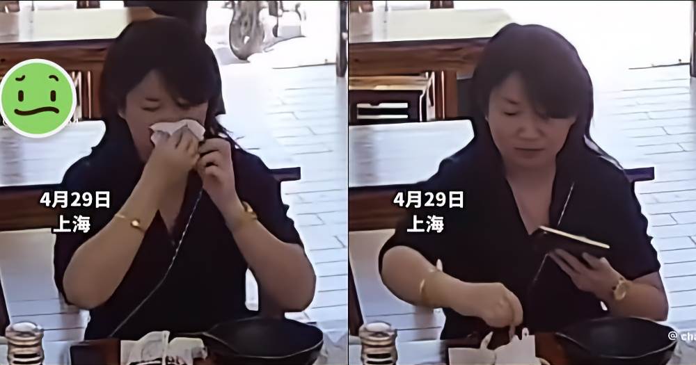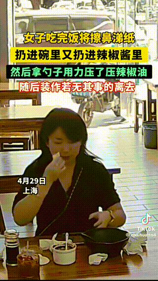 視訊的主要內容令人震驚:一名女子用餐后,把擦鼻涕的紙巾扔進碗里,還混入辣椒醬中。接著她用力按壓著混合辣椒油,然后若無其事地離開現場。